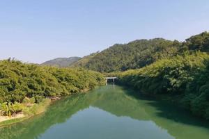 两岸翠竹掩映,农田、村庄点缀在山岗上、河流边、竹林间,一派竹乡田园风光。