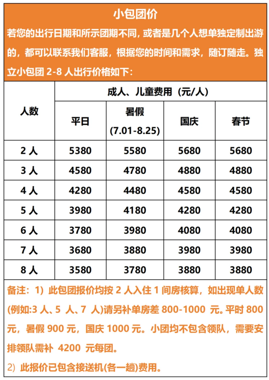 【活动费用】:平时成人3480元/人,儿童:1600元/人;暑假旺季3680元/人,儿童:1800元/人;国庆节/春节成人3880元/人,儿童:1900元/人;儿童价格(不占床位和门票,如若产生门票费用则自理);