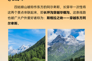行程概览:早上从集合点出发,途经映秀、卧龙,“熊猫之乡”、“宝贵的生物基因库”、“天然动植物园”——卧龙大自然秀丽风光,顺着盘山公路翻越巴郎山,经猫鼻梁观四姑娘山全景然后抵达长坪沟景区,乘坐景区观光车进入长坪沟,内有古柏幽道、喇嘛寺、干海子及高数十米的飞瀑,并有奇石之景。夏天,山野间鲜花争相盛开;秋日,赤桦与红枫竞艳。历经沧桑的翠柏青松郁郁葱葱,飞瀑流泉在密林中哗哗作响,古代驿路在茫茫林海里穿梭延伸。今天晚上在四姑娘山幺妹峰脚下的木骡子营地露营。