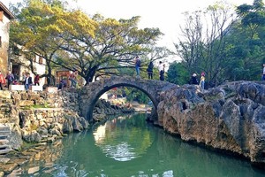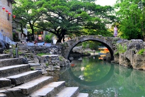 10:30 补眠到自然醒,跟随领队的脚步,细细品味。我们进入古镇,穿过门楼,门里门外皆为石板街。这里都是上百年的老街,块块石板,泛出亮光,平滑如镜,。来到带龙桥,此处风景幽美,吸引了众多镜头和画者,电影《面纱》就曾在此取景。一切的景色画面,若隐若现,仿佛穿越时空,这种古朴、清凉、悠远。古镇上有好几处跳跳桥,也是镇上人们的“交通要道”,也是驴友的摄影好去处。