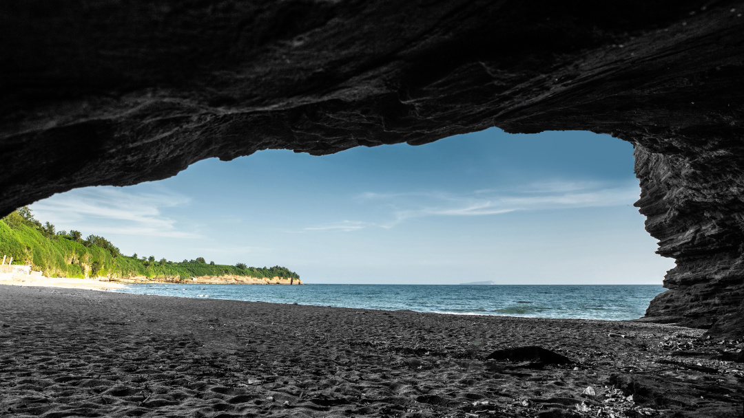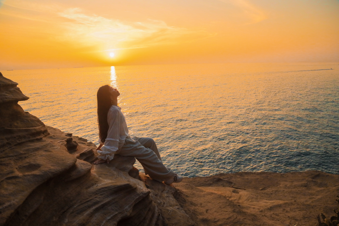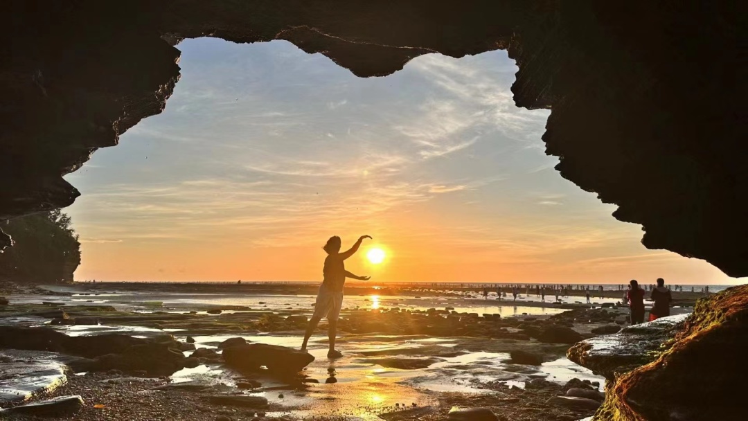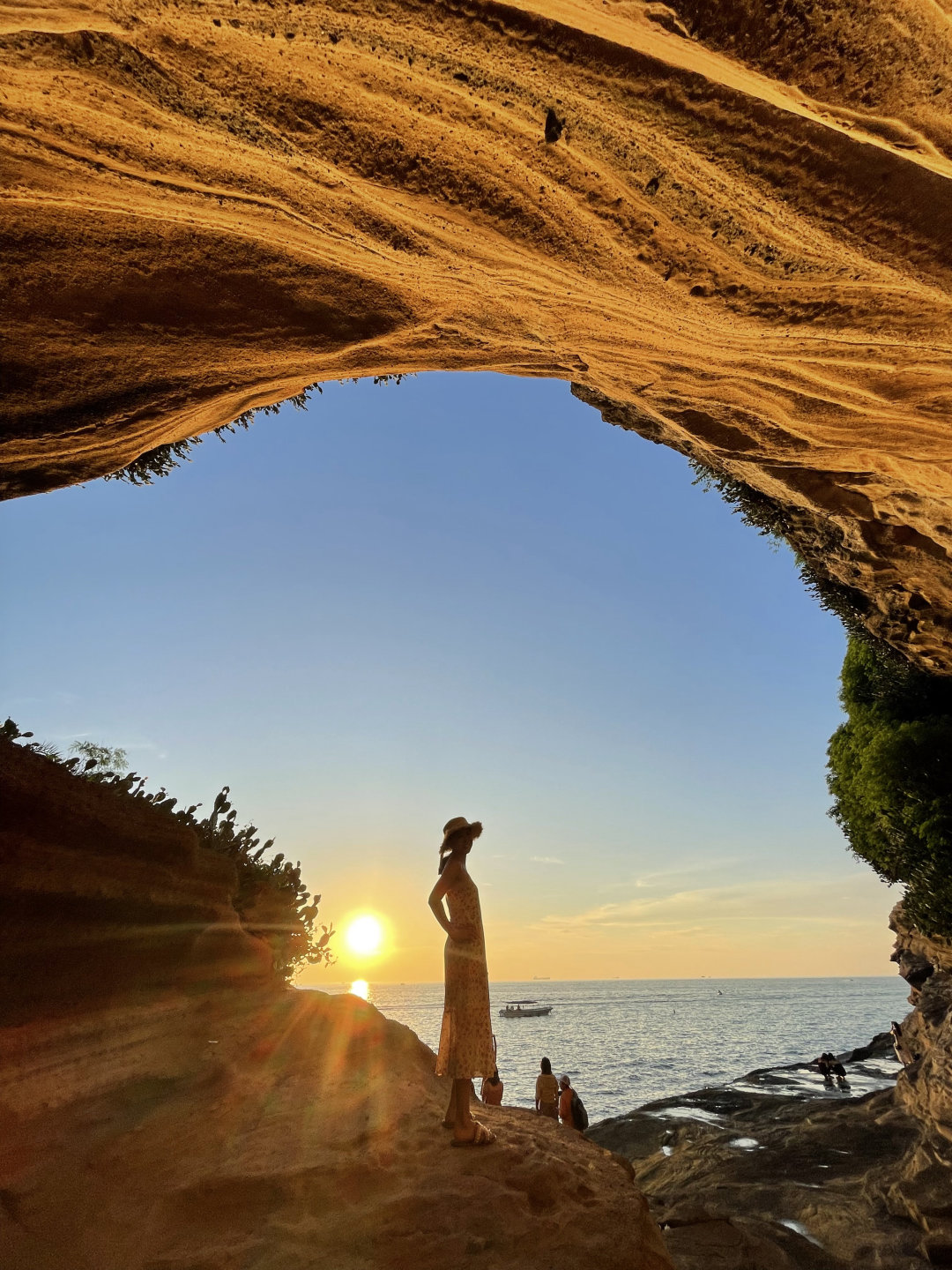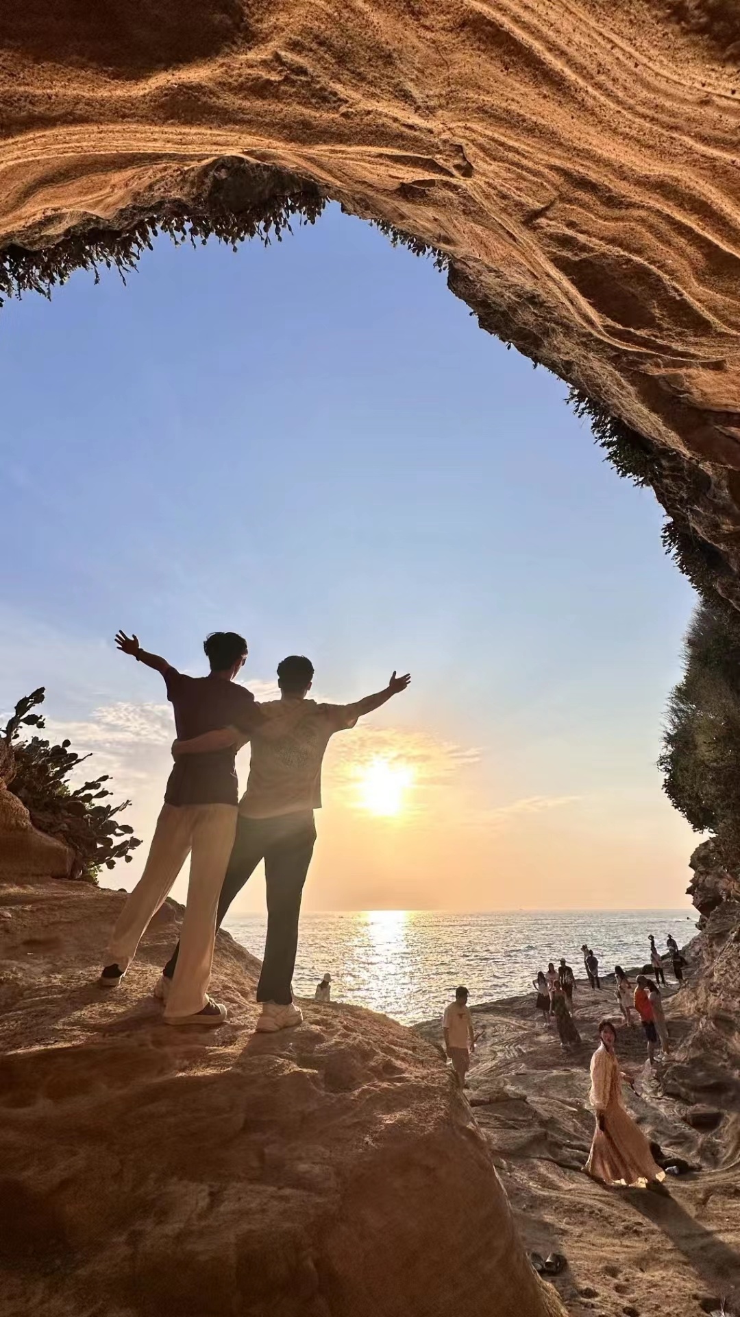和心爱的人坐在海蚀洞内的珊瑚石上