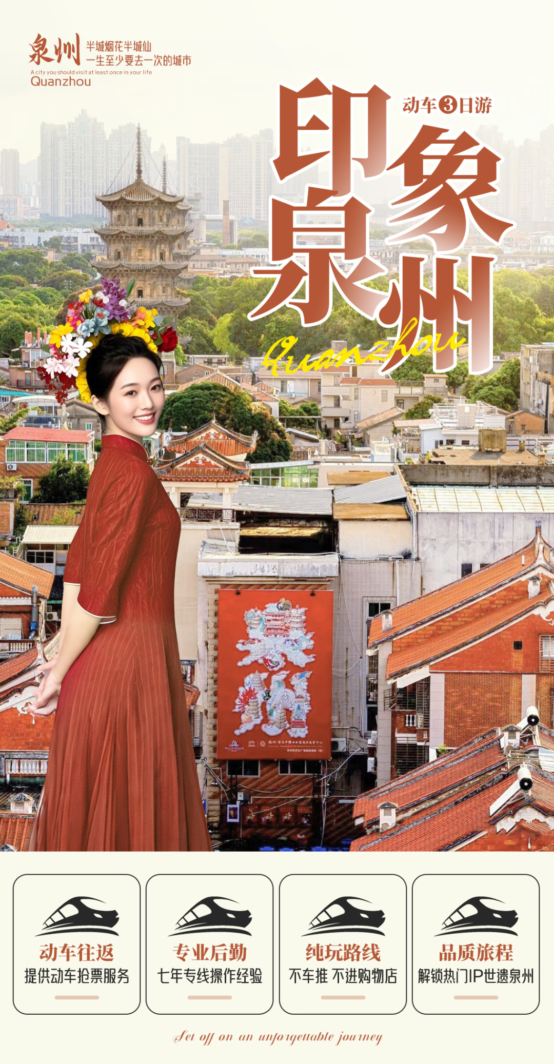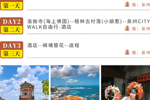 根据大交通时间,乘动车前往泉州,泉州是国务院首批历史文化名城、东亚文化之都、古代“海上丝绸之路”起点城市,文化积淀深厚,素有“海滨邹鲁” 、“世界宗教博物馆” 、“光明之城”的美誉。泉州属亚热带海洋性季风气候,终年温暖湿润,四季如春,古诗称泉州“四季有花 常见雨,一冬无雪却闻雷” ,故泉州有“温陵”之雅称。