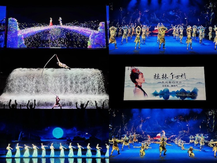 以桂林本土文化为基础,精心打造了一台大型歌舞节目,通过深入挖掘和梳理桂林的历史文化与风土人情,形成了包括《远古的呼唤》《大地飞歌》《米粉传情》《靖江王府》《刘三姐》等5场演出内容,全方位反映了桂林的历史文化与风土人情。