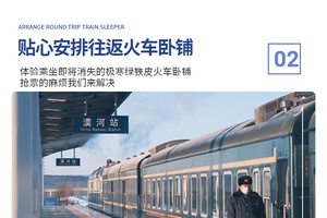 6、火车:哈尔滨-漠河往返火车硬卧(铺位随机,一起报名的小伙伴尽量安排同一节车厢,但冬季票务紧张无法保证,建议提前15天以上预定,15天以内报名请现询是否有票)