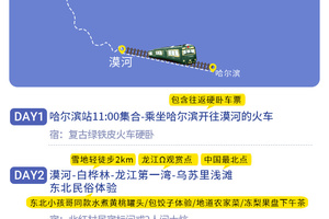 北极村-最北邮局-最北哨所-最北广场-漠河舞厅-漠河(90km,车程约1.5小时)-漠河-哈尔滨硬卧