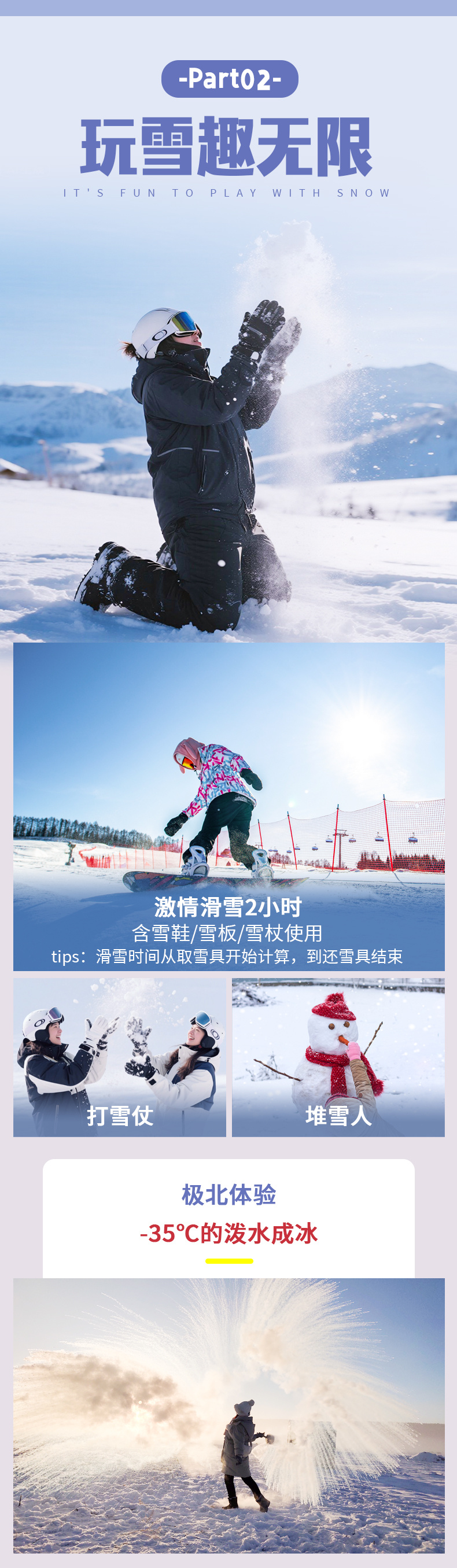 13:30换上我们提供的雪鞋、雪板、雪杖等滑雪用具,开始我们刺激的【滑雪2小时】。当您从山坡平稳的滑下来的那一刹那,瞬间有了征服大自然的感觉!