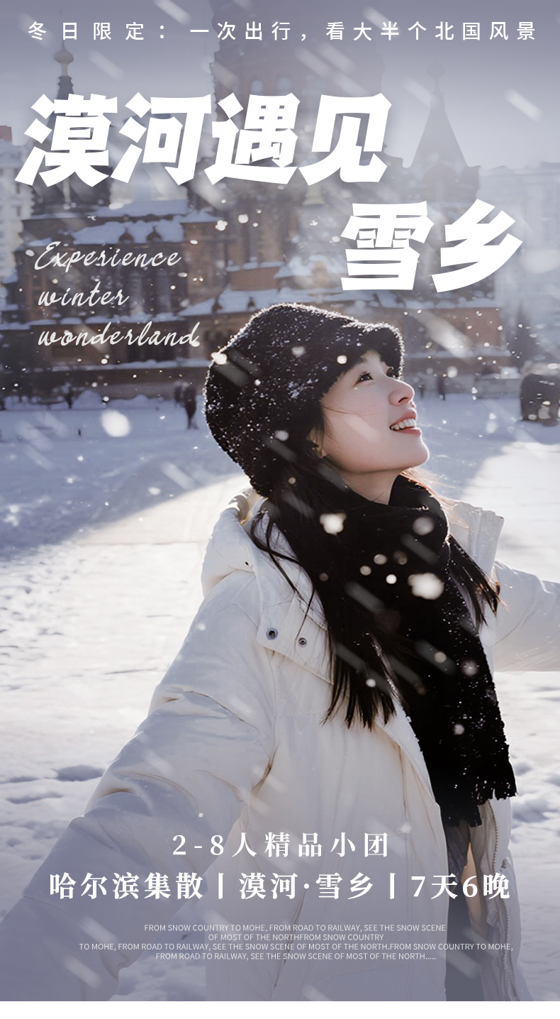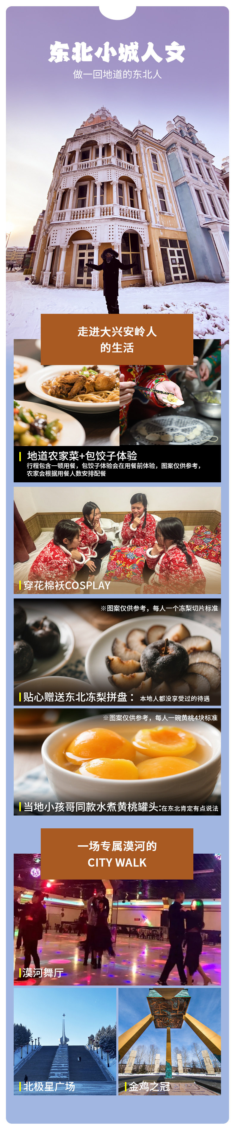 漠河-白桦林雪地轻徒步2km-(150km,车程约2.5小时)龙江第一湾-乌苏里浅滩-(40km,车程约1小时)北红村-东北特色农家菜-包饺子体验-水煮黄桃罐头-冻梨拼盘