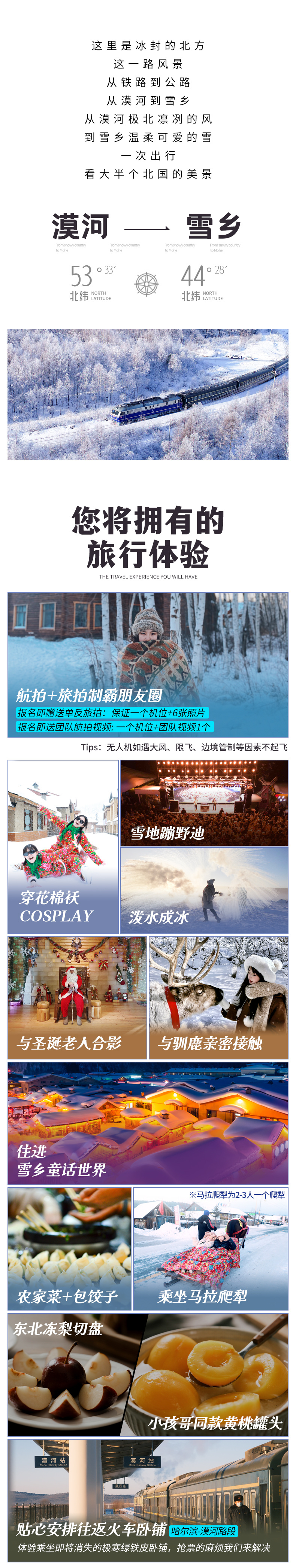 4、门票:雪乡门票+往返环保车、梦幻雪山门票、龙江第一湾门票、圣诞村门票、漠河2小时滑雪(包含雪鞋雪板雪杖)、北极村门票、鄂温克驯鹿园;