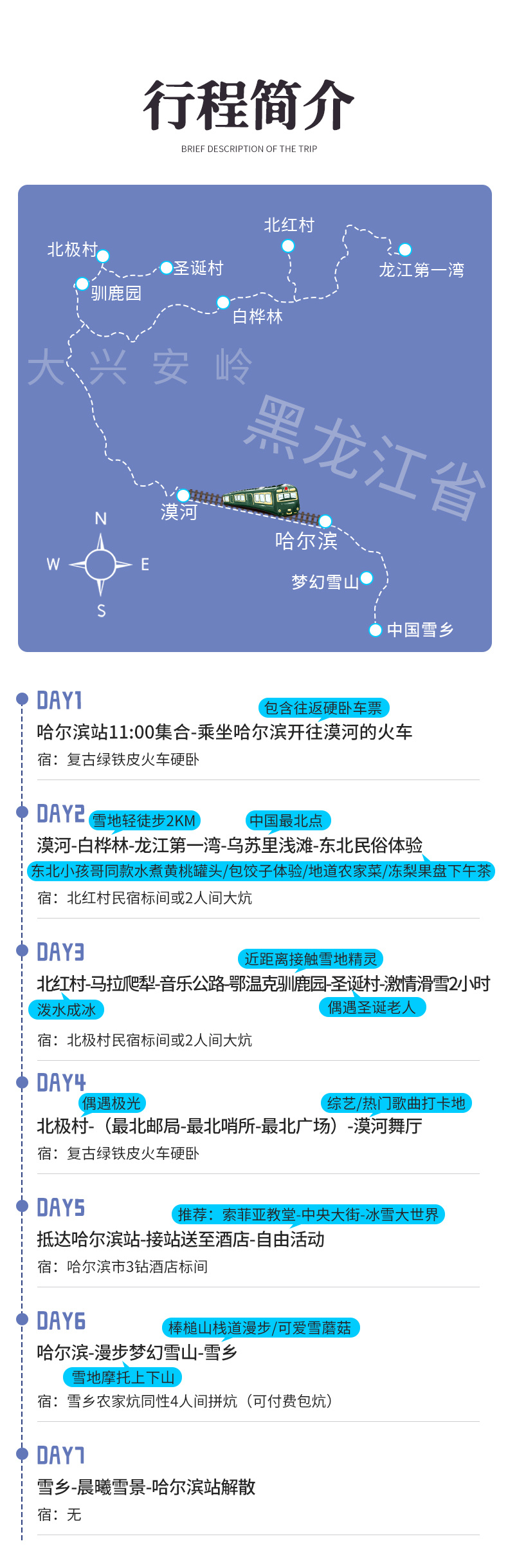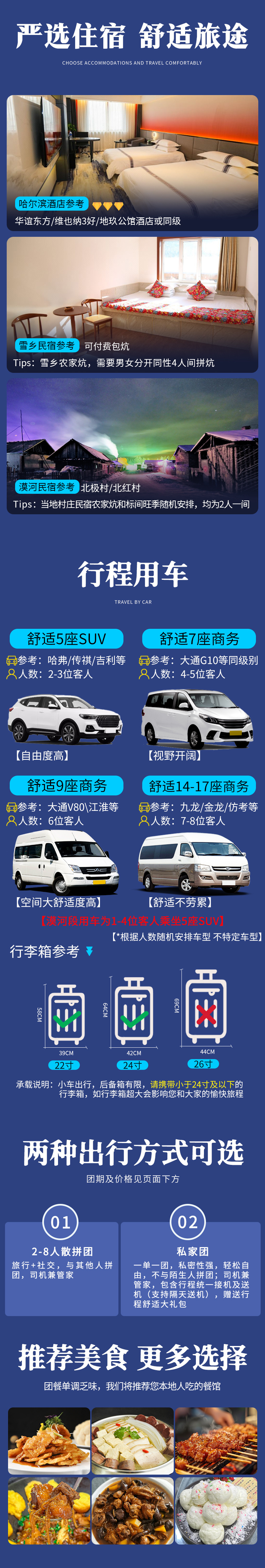 4、不含接送机,如需安排请最少提前2日和客服联系,哈尔滨接送机包车5座轿车150元/趟,夜航190元;7座商务车240元/趟,夜航290元/趟;夜航时间为21:00及以后-次日07:00及之前落地或起飞的航班,春节团期+50元/台车,包车费用以太平机场前往哈尔滨主城区定价(南岗区、道里区、道外区),如需包车前往其他区域请联系客服现询价,接送机春节价格请现询。