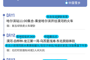 11:00到达哈尔滨火车站集合,随后自行取票乘车(准确集合时间和集合火车站及车次以当天通知为准,会有工作人员提前联系)。