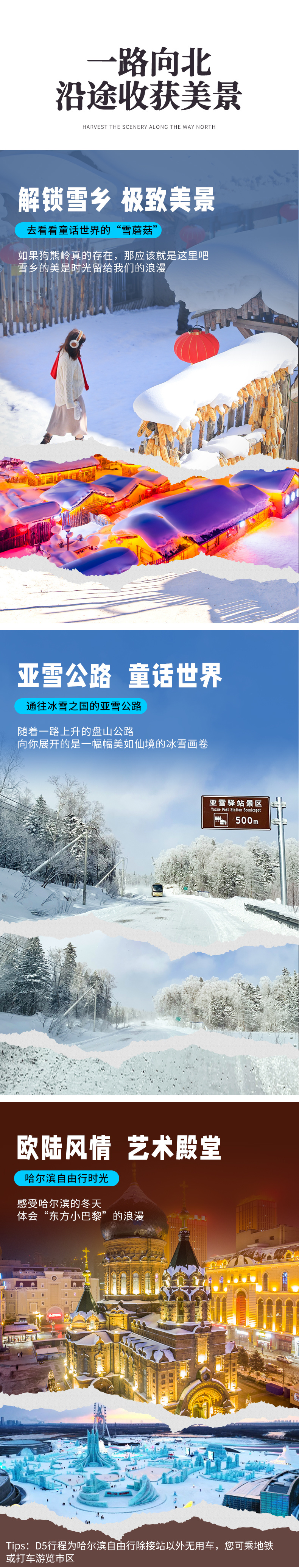 哈尔滨-亚雪公路-(280km,约5小时)漫步梦幻雪山-雪地摩托冲浪上下山-(30km,约0.5h)雪乡夜景-雪地蹦迪