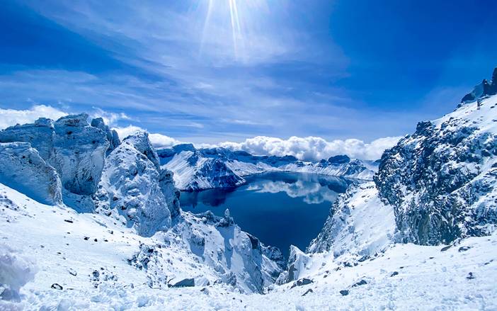 13:00 乘倒站车返回到中转服务站,换乘环保车赴【长白瀑布】,车程约10分钟,步行约20分钟到达长白冰雪瀑布底部近距离观看、摄影,参观【聚龙温泉群】,周围一片白雪,中间却热气腾腾,甚是美丽,游览30分钟,步行20分钟返回瀑布停车场。