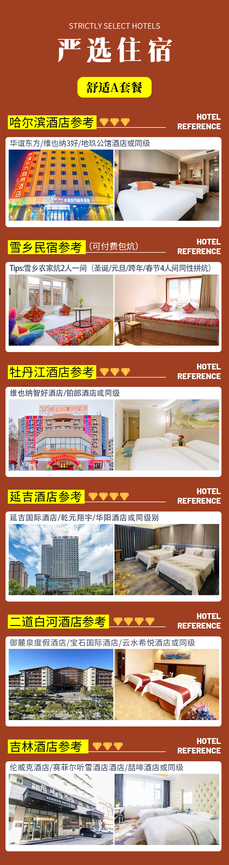 备注:钻级标准参考携程钻级标准,东北经济发展较差,酒店已经是我们精心挑选的,但是和大城市同级别酒店相比各方面略差一些,敬请您谅解;