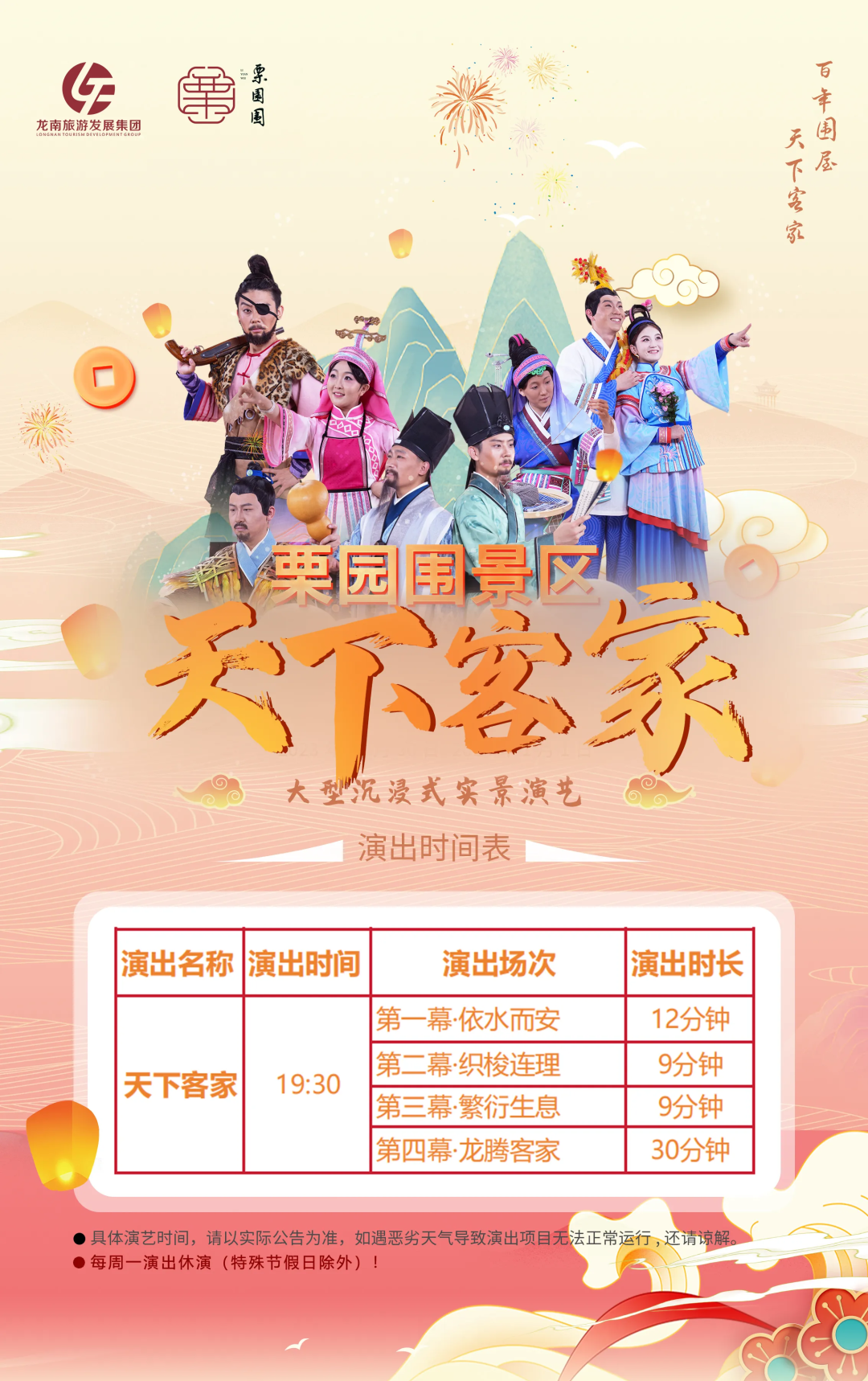 18:40 集合前往龙南栗园围《天下客家》大型演艺(一般晚上七点至七点半开始,表演时间60分钟,根据景区安排场次时间,如遇调整或取消,不做补偿哦)