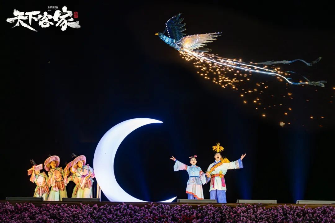 织多彩梦、约定终身月色渐渐升起,客家小伙唱起了客家情歌,妙龄 少女随着歌声在月色下的翩翩起舞,好似夜空中的精灵。他们彼此互诉爱慕之意,定格在月辉之下,情意绵长。