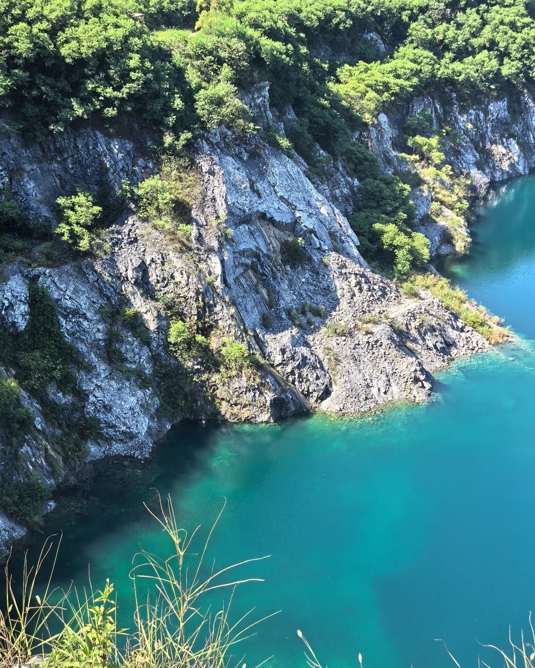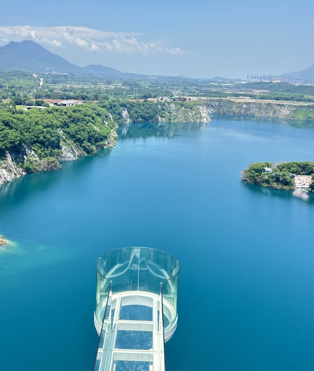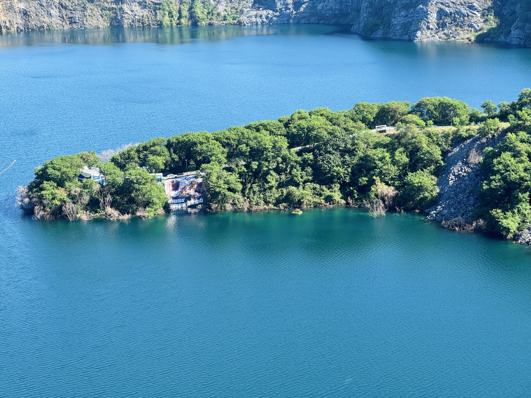 10:00 左右到达“广东版蓝眼泪”,青山绿水环绕,湖水蓝得像宝石,旧矿山改造的咖啡馆也太有感觉了。工业风+自然景完美碰撞!阳光洒在湖面上,湖水蓝得像巨大的蓝宝石,波光粼粼(游玩约90分钟)