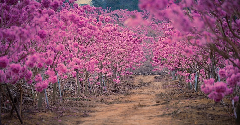 果实为蓇葖果,向下开裂,有许多绒毛以利种子散播。 紫花风铃木算是这几年冒出来的网红了,元旦前后,满树铃铛,姹紫嫣红。