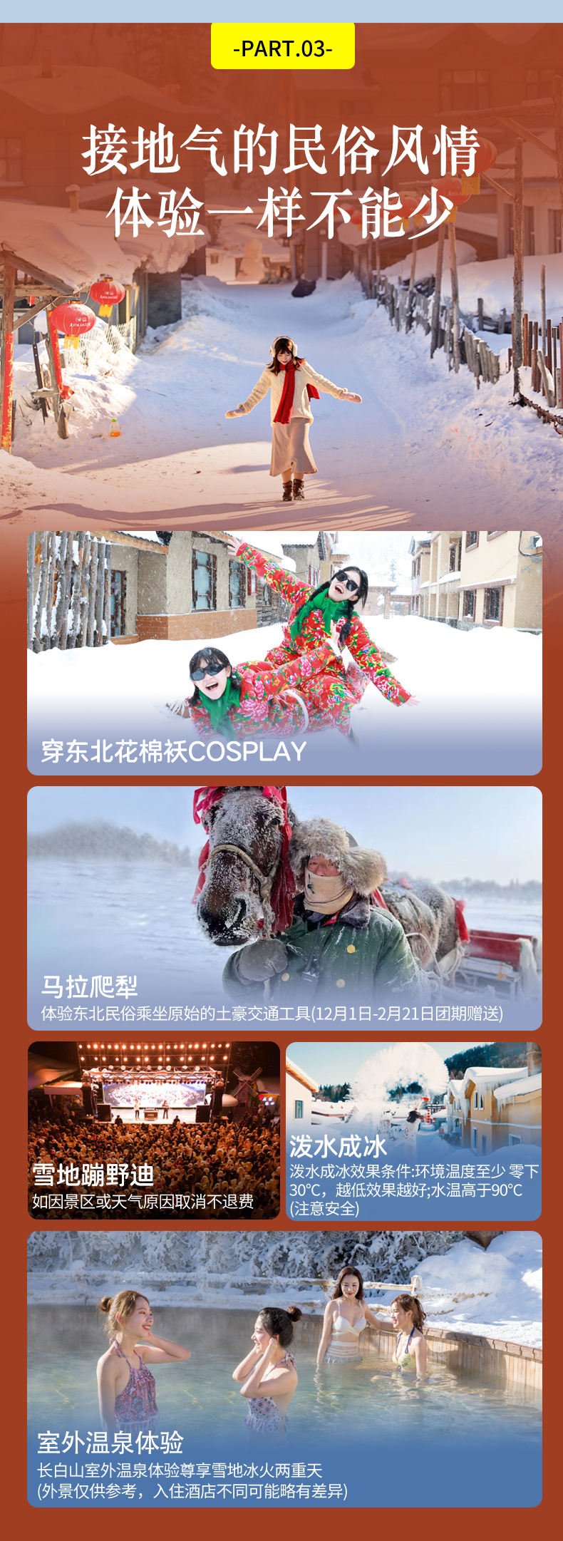 4、门票:雪乡门票+往返环保车、梦幻雪山徒步穿越门票、图们中朝友谊桥门票、朝鲜民俗园门票、长白山北景区全含(门票+往返环保车+摆渡车+天池倒站车)、雪地漂流门票、滑雪场套票包含(雪鞋雪板雪杖使用+滑雪3小时+雪圈1小时,滑雪时间从取雪具开始计算,到还雪具结束);