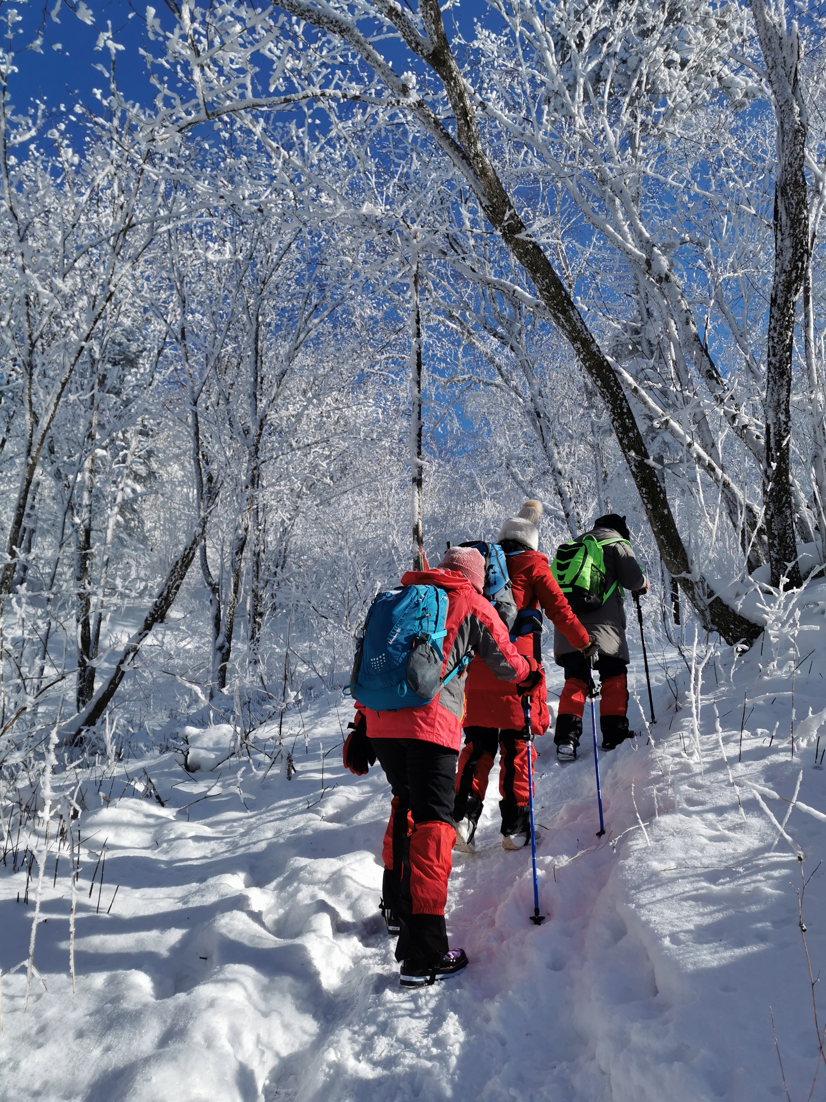 08:30前往【梦幻雪山轻徒步】,我们来到山脚,换上我们的登山雪套后随后跟着领队一步一个脚印上山;上山全程徒步4公里左右,用时约3小时,我们一路上边走边玩,移步换景,大家互相打闹着,玩雪,千万要注意安全哦~