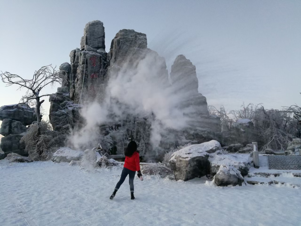 13:00 乘倒站车返回到中转服务站,换乘环保车赴【长白瀑布】,车程约10分钟,步行约20分钟到达长白冰雪瀑布底部近距离观看、摄影,参观【聚龙温泉群】,周围一片白雪,中间却热气腾腾,甚是美丽,游览30分钟,步行20分钟返回瀑布停车场。
